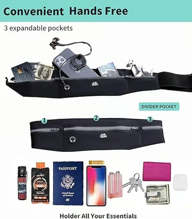 【SAFER and MORE COMFORTABLE TRAVELING】: THREE POCKETS Roomy running fanny pack for your valuables, put it around your waist, cover with shirt or jacket. Perfect for storing your essentials during large crowd events.